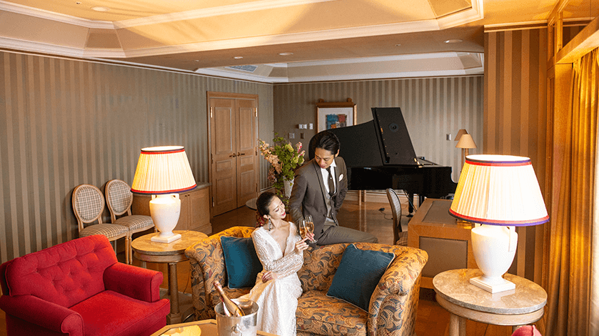 た装い。客室からの風景をバックに、非日常感溢れるラグジュ